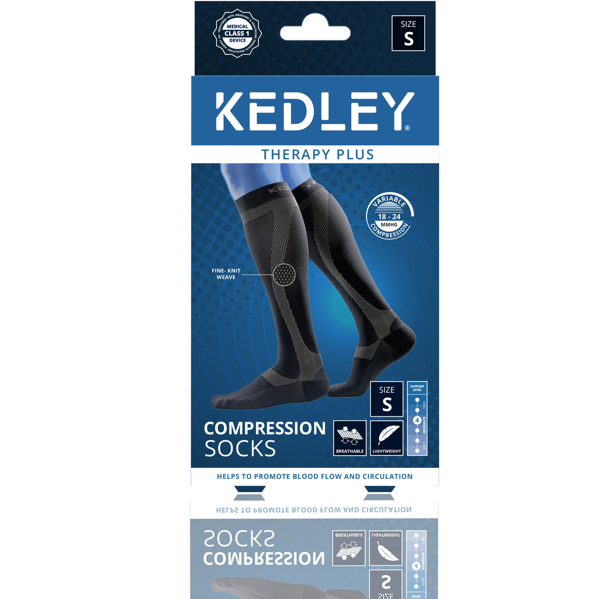 The KEDLEY Compression Socks provide variable targeted compression, which gradually decreases from the ankle up the lower leg, increasing blood flow and circulation to the area. The socks have been constructed to add additional protection and support to the Achilles tendon and ankle. The calf cradle provides support for the calves and reduces strain. The V-guard shin protection reduces vibration, to help ease pain and prevent shin splints. The top band is designed for comfort and to prevent slipping, while the seamless toe of the sock reduces friction and irritation.
