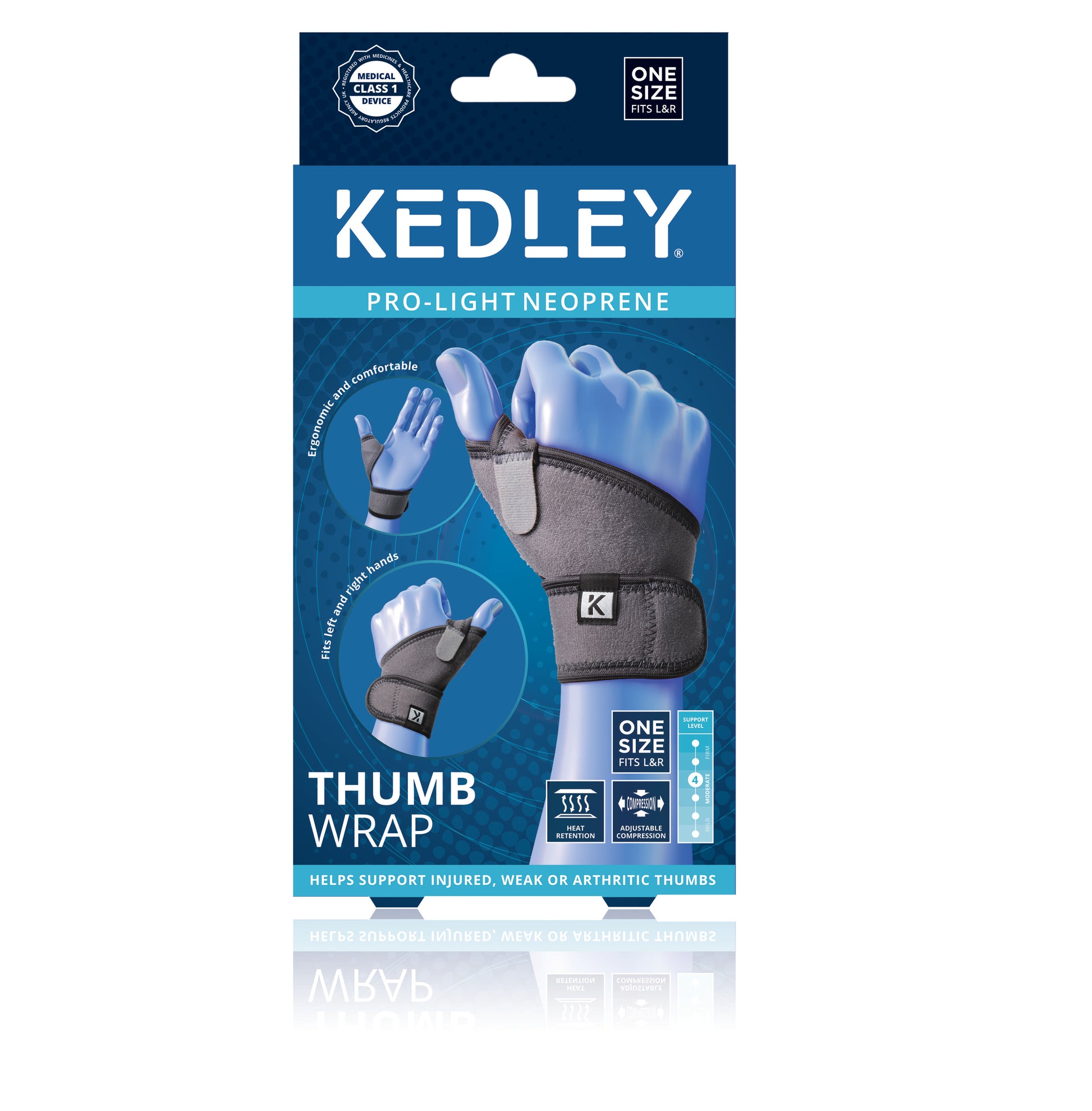 The Kedley Thumb Wrap incorporates the base of the thumb to provide a secure fit. The adjustable strap provides comfortable support and stability. The wrap-around velcro strap allows for easy adjustment.